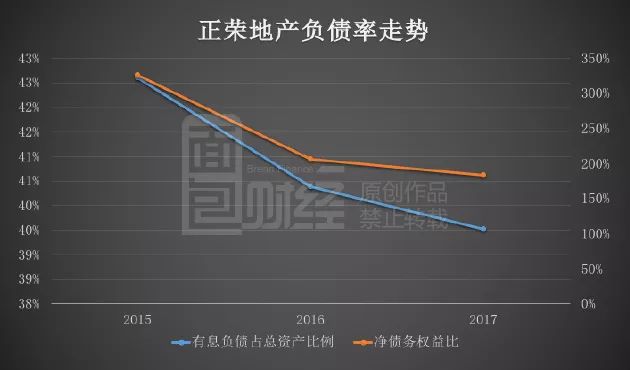 2017年末,正榮地產凈債務權益比為183.2%,較2015年下降了42%。