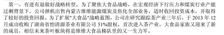 2013年12月,維維股份以7650萬元的對價收購了湖南省怡清源茶業有限公司51%的股權。公司在2013年年度報告中表示: