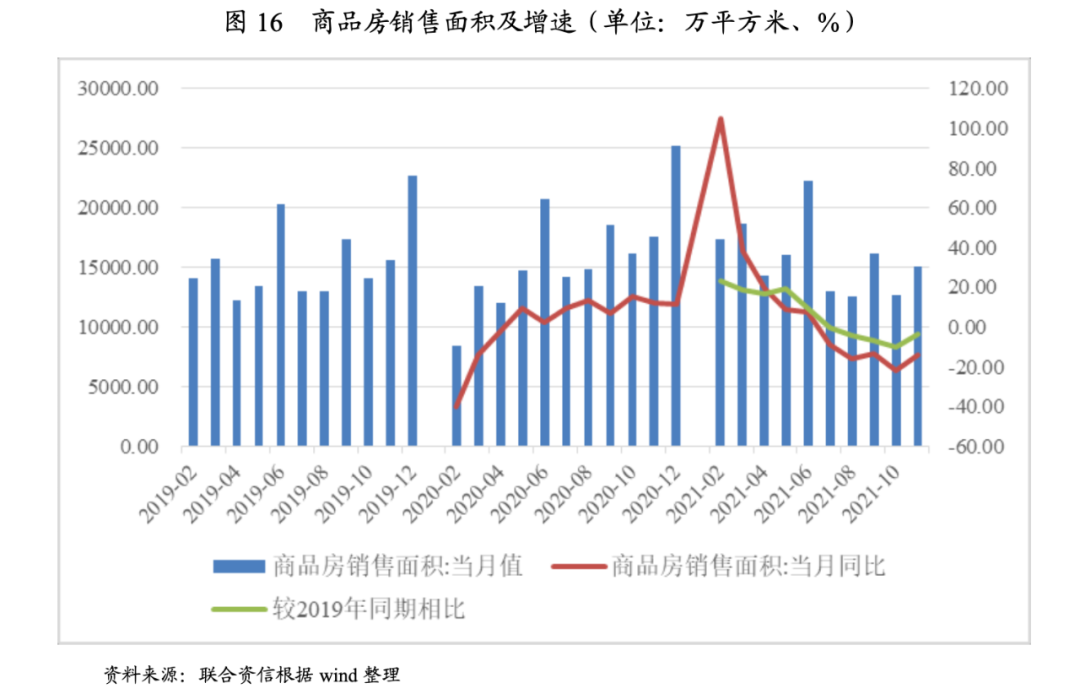 短期看,商品房的需求與貨幣政策及購房者的預期息息相關。2021年1-11月,行業商品房銷售面積同比增長4.80%至15.81萬平方米,商品房銷售額同比增長8.50%至16.17萬億元,但上下半年,國內房地產銷售市場可謂冰火兩重天。2021年上半年,商品房銷售面積較2020年同期增長27.70%,較2019年同期增長16.96%;下半年,政府管控按揭力度,直接抑制了部分置換需求,此外房企為回籠資金促銷部分樓盤,樓盤價格下降壓低了購房者對未來的預期,商品房市場景氣度迅速回落,7-11月單月銷售面積環比增速分別為-8.54%、-15.55%、-13.17%、-21.65%和-13.97%。