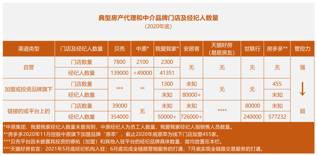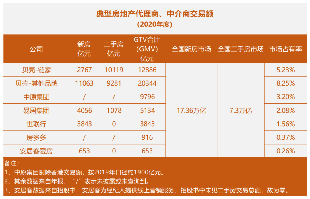 貝殼、房多多、房天下、我愛我、世聯行2020年報,安居客招股書,中原集團官網。