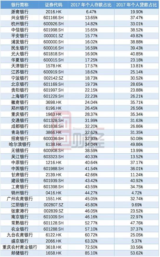 在梳理浙商銀行的存款構(gòu)成時(shí),我們發(fā)現(xiàn)了一個(gè)令人驚訝的數(shù)據(jù)。先看A股和港股41家上市銀行2017年個(gè)人存款占存款總額的排名情況: