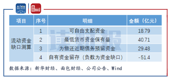 公司48.33億元貨幣資金余額中,僅18.79億元為可自由支配資金。經公司對最低貨幣保有量以及為償還近期債務預留資金的相關測算,截至2021年9月30日,公司流動資金缺口高達51.4億元。