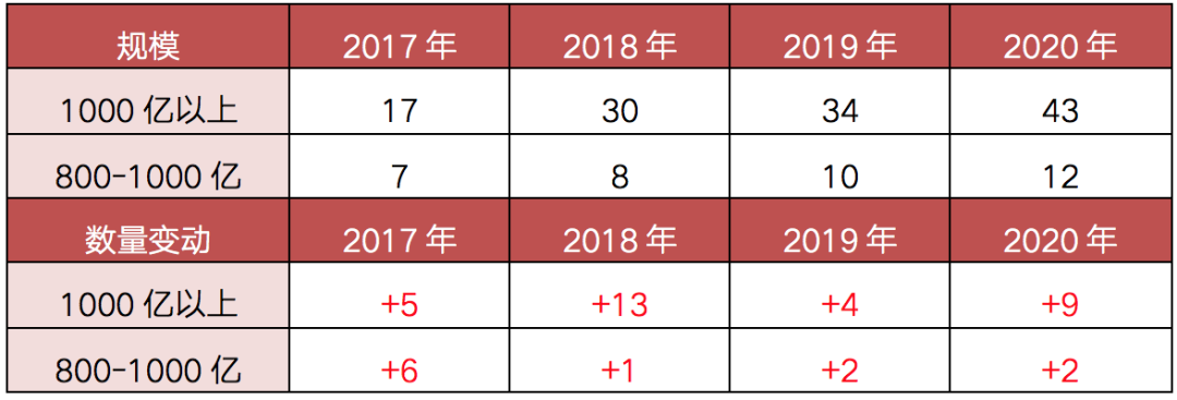 截至2020年末,全口徑千億房企數(shù)量相比去年增加9家至43家,規(guī)模為800-1000億的房企數(shù)達(dá)到12家,800億以上房企梯隊(duì)繼續(xù)擴(kuò)容。