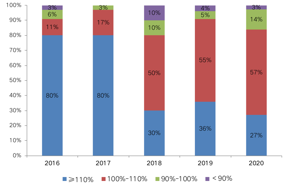 2020年,中國(guó)房地產(chǎn)市場(chǎng)整體銷售表現(xiàn)受疫情影響較大,7月之后雖然百?gòu)?qiáng)房企累計(jì)業(yè)績(jī)?cè)鏊僖呀?jīng)回正,但四季度市場(chǎng)整體的下行壓力猶存、去化承壓。規(guī)模房企整體的目標(biāo)完成情況不及2018、2019年同期。