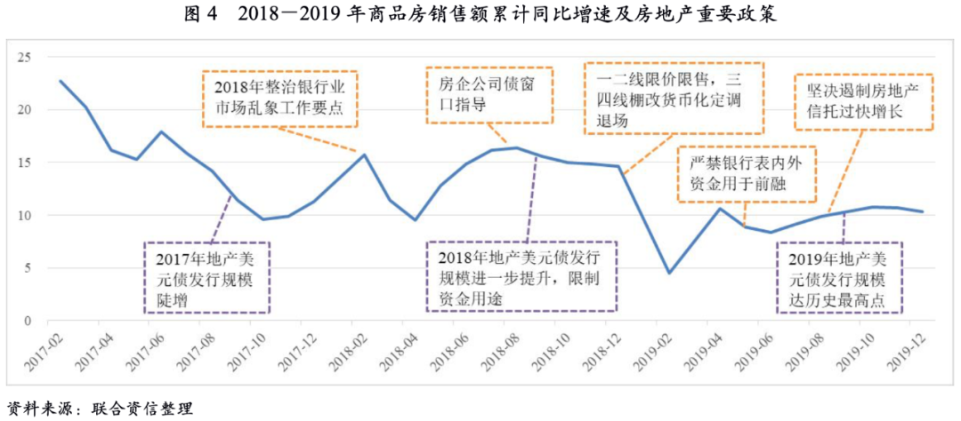 在負(fù)債端,各項(xiàng)房地產(chǎn)融資調(diào)控政策層出不窮,涵蓋銀行、資本市場、非標(biāo)等各類融資渠道。銀行方面,房地產(chǎn)開發(fā)貸的準(zhǔn)入標(biāo)準(zhǔn)提升,中小房企獲取開發(fā)貸的難度加大;并購貸開始實(shí)行穿透監(jiān)管;限制銀行表內(nèi)外資金投向非標(biāo),尤其是房企通過委托貸款融資的途徑受到嚴(yán)格限制。債券市場方面,2018年7月監(jiān)管層實(shí)施窗口指導(dǎo),進(jìn)一步收緊房企融資,禁止公司債與票據(jù)互還,發(fā)行新債僅限于借新還舊和長租公寓領(lǐng)域。信托方面,雖然2017年監(jiān)管多次強(qiáng)調(diào)信托資金不得違規(guī)投向房地產(chǎn),但由于房地產(chǎn)信托產(chǎn)品的高收益率,2017-2018年房地產(chǎn)信托融資規(guī)模依然居高不下;2019年7月監(jiān)管對信托公司進(jìn)行約談和窗口指導(dǎo)后,房地產(chǎn)信托新增融資規(guī)模開始顯著下降。