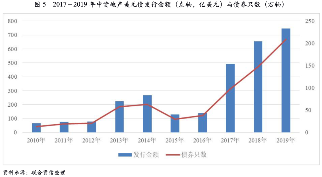 從這個(gè)階段的周期走勢可以看出,雖然行業(yè)整體呈下行趨勢,但下行的幅度一般。地產(chǎn)依然保有韌性的重要原因之一是美元債融資快速增長。美元債融資渠道的暢通,使得許多房企在三四線市場下行、利潤率下滑、境內(nèi)融資收緊的不利環(huán)境下,仍然具備流動(dòng)性。在行業(yè)集中度提升的必然趨勢下,許多房企將“規(guī)模”視為在行業(yè)中存活下去最重要的因素,利用美元債進(jìn)一步加杠桿,在追求規(guī)模的道路上犧牲了企業(yè)財(cái)務(wù)健康,埋下風(fēng)險(xiǎn)隱患。