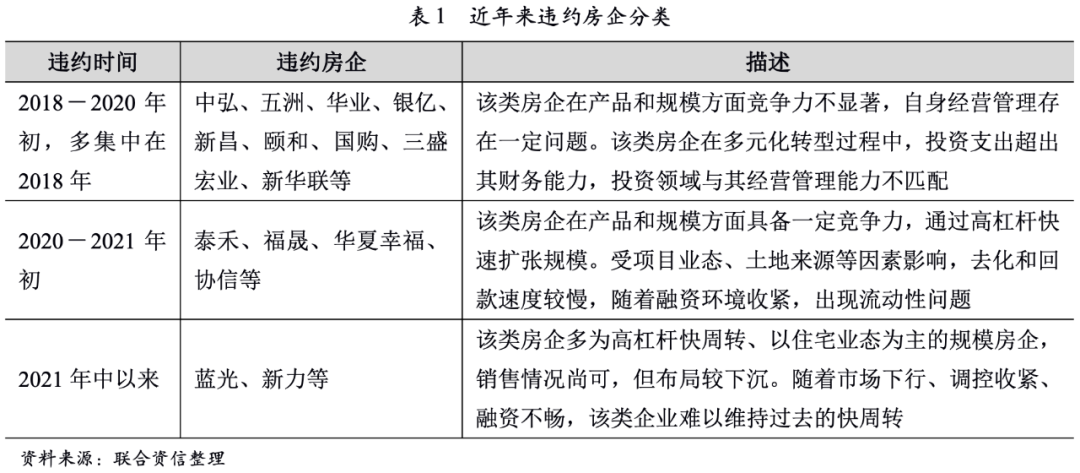 本階段的違約房企以高杠桿且經(jīng)營回款相對較慢的大中型房企為主。與2018-2019年階段違約的房企不同,本階段的違約房企大多在產(chǎn)品和規(guī)模方面具備一定的競爭力,但受項(xiàng)目業(yè)態(tài)(如豪宅、產(chǎn)業(yè)新城、商業(yè)地產(chǎn)等)或土地來源(如舊改)等因素影響,去化和回款速度較慢。這些房企在信貸寬松時(shí)期依賴高杠桿維持正常運(yùn)營,2018年起隨著融資趨緊開始出現(xiàn)流動(dòng)性問題,經(jīng)歷2~3年的流動(dòng)性消耗后暴露風(fēng)險(xiǎn)。