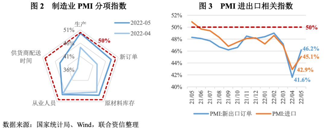 2022年5月,中國制造業采購經理指數(PMI)、非制造業商務活動指數和綜合PMI產出指數分別為49.6%、47.8%和48.4%,均低于臨界點,但較上月分別回升2.2個、5.9個和5.7個百分點。主流觀點認為,雖然三大指數均在臨界點以下,但環比明顯回升,表明“近期疫情形勢和國際局勢變化等因素對經濟運行造成較大沖擊,但隨著高效統籌疫情防控和經濟社會發展成效顯現,我國經濟景氣水平較4月份有所改善”。根據國家統計局PMI指數的調查和計算方法,5月數據顯示中國經濟繼續處于收縮區間,所謂的“改善”,指的是5月經濟收縮的幅度較4月大幅減小,而非總體狀況有所好轉。聯合資信認為,5月數據說明中國制造業出現探底企穩跡象,而服務業繼續維持收縮態勢。未來,隨著疫情得到全面控制,生產生活進入常態化,穩增長的一攬子政策措施效應逐步顯現,中國經濟將重返擴張區間,保持合理增長。