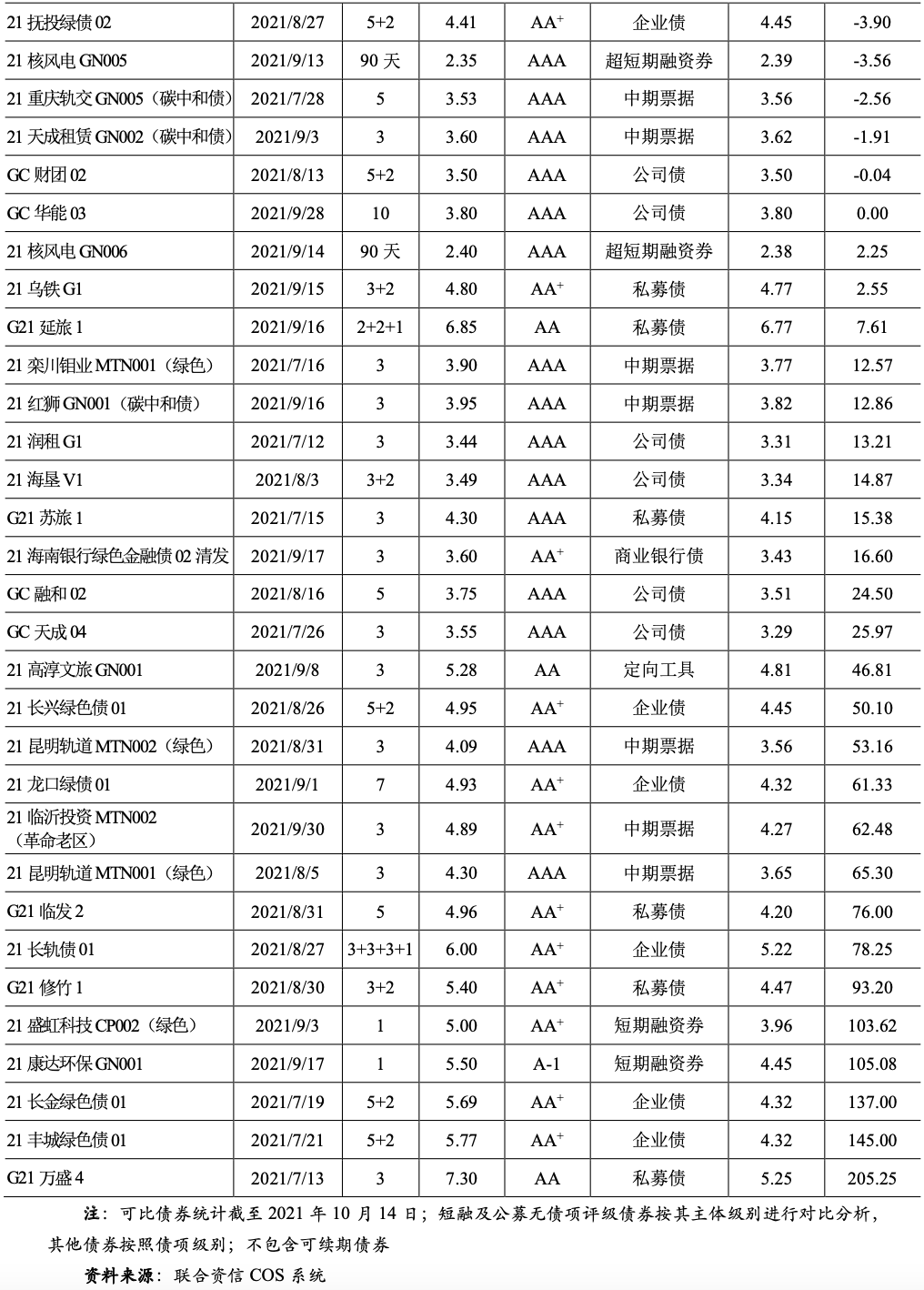 2021年三季度,聯(lián)合資信受托為綠色其他金融機(jī)構(gòu)債“21浦銀租賃綠色債”、綠色商業(yè)銀行債“21昌吉農(nóng)商綠色金融債01”“21工商銀行綠色金融債01”、綠色公司債“21潤(rùn)租G1”“GC凱盛01”“GC華能03”“GC華能02”、綠色私募債“G21潯開(kāi)1”、綠色中期票據(jù)“21香城投資MTN002(碳中和債)”“21京能源GN001(碳中和債)”“21錫交通MTN005(碳中和債)”“21京能潔能GN001(碳中和債)”“21國(guó)家能源GN001”“21國(guó)家能源GN002”“21光大綠環(huán)MTN001(碳中和債)”“深能源MTN001(碳中和債)”“21粵電開(kāi)GN001(碳中和債)”“21興城投資GN001”“21魯能源GN005(碳中和債)”、綠色超短期融資券“21山東核電SCP009(碳中和債)”“21核風(fēng)電GN004”“21核風(fēng)電GN005”“21核風(fēng)電GN006”、綠色短期融資券“21平高CP003(綠色)”“21盛虹科技CP002(綠色)”、綠色定向工具“21德清經(jīng)開(kāi)GN001(項(xiàng)目收益)”和綠色資產(chǎn)支持票據(jù)“國(guó)能生物2021-1”提供信用評(píng)級(jí)。聯(lián)合資信所評(píng)綠色債券發(fā)行期數(shù)(27期)、發(fā)行家數(shù)(23家)和發(fā)行規(guī)模(430.57億元)在2021年三季度有評(píng)級(jí)的綠色債券總發(fā)行期數(shù)、發(fā)行家數(shù)和發(fā)行規(guī)模中的占比分別為24.32%、28.05%和32.79%,聯(lián)合資信所評(píng)綠色債券發(fā)行期數(shù)、家數(shù)和規(guī)模均位列市場(chǎng)第二。其中,“GC凱盛01”“21平高CP003(綠色)”“21京能源GN001(碳中和債)”“21國(guó)家能源GN001”“21國(guó)家能源GN002”“21粵電開(kāi)GN001(碳中和債)”“21錫交通MTN005(碳中和債)”“21興城投資GN001”“21工商銀行綠色金融債01”“G21潯開(kāi)1”“21核風(fēng)電GN004”“GC華能02”“深能源MTN001(碳中和債)”“21光大綠環(huán)MTN001(碳中和債)”“21魯能源GN005(碳中和債)”“21核風(fēng)電GN005”16只債券具有成本優(yōu)勢(shì)[1],成本優(yōu)勢(shì)分別為261.67BP、118.46BP、103.00BP、75.58BP、75.57BP、49.02BP、46.58BP、41.64BP、39.00BP、36.07BP、34.30BP、34.22BP、30.55BP、22.14BP、13.92BP和3.56BP。