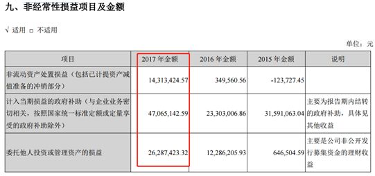 財報顯示:公司利潤大幅飆升主要因政府補助、處置資產(chǎn)及理財收益等非經(jīng)常性損益大幅增加。2017年,公司政府補助、處置資產(chǎn)及理財收益合計金額約8766.6萬元,占到當(dāng)期歸母凈利潤的83%。以下為年報披露數(shù)據(jù):