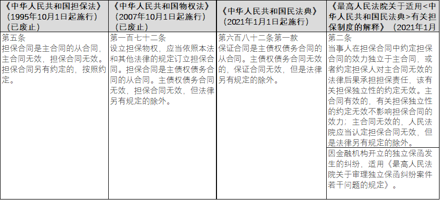 2021年是我國(guó)法律體系“辭舊迎新”的一年,《中華人民共和國(guó)民法典》(以下簡(jiǎn)稱“《民法典》”)自2021年1月1日正式施行,這是中國(guó)首部以法典命名的法律。在《民法典》時(shí)代下,擔(dān)保制度進(jìn)行了重大完善。在被廢止的116件司法解釋及相關(guān)規(guī)范性文件中,與擔(dān)保有關(guān)的9件司法解釋被廢止。于此同時(shí),最高人民法院針對(duì)民法典中關(guān)于擔(dān)保制度的規(guī)定,新制訂了《最高人民法院關(guān)于適用<中華人民共和國(guó)民法典>有關(guān)擔(dān)保制度的解釋》(以下簡(jiǎn)稱“《擔(dān)保解釋》”)(法釋﹝2020﹞28號(hào),2021年1月1日起施行)。基于此,本文就《民法典》及《擔(dān)保解釋》中對(duì)擔(dān)保合同中獨(dú)立性條款的有關(guān)規(guī)定及適用《民法典》的溯及力問(wèn)題進(jìn)行論述。