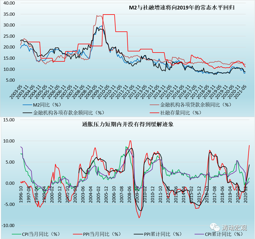 截至2021年5月,社融、M2、存款與貸款增速已分別降至11%、8.30%、8.90%和12.20%,較2020年同期均有明顯下降。我們認(rèn)為,考慮到M2與社融已接近潛在名義經(jīng)濟(jì)增速水平,預(yù)計(jì)下半年上面四個(gè)指標(biāo)還會(huì)有約0.50個(gè)百分點(diǎn)左右的下降空間,回歸至2019年的常態(tài)水平。
