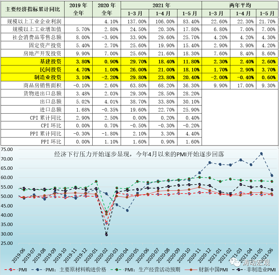 2、從三駕馬車的表現(xiàn)來(lái)看,消費(fèi)與投資等內(nèi)需整體上仍處于低位緩慢修復(fù)態(tài)勢(shì),房地產(chǎn)投資與貿(mào)易端延續(xù)了2020年的表現(xiàn),對(duì)上半年的經(jīng)濟(jì)修復(fù)貢獻(xiàn)力度較大,如1-5月的房地產(chǎn)投資累計(jì)同比、貨物進(jìn)出口總額累計(jì)同比分別達(dá)到8.60%和28.20%。其中,房地產(chǎn)投資累計(jì)同比的兩年平均值高達(dá)8.60%,1-5月民間投資與制造業(yè)投資累計(jì)同比的兩年平均值則分別為3.70%和0.60%,較2019年的水平還有不少距離。同時(shí)PPI上行壓力亦比較大,但CPI弱勢(shì)仍比較明顯。
