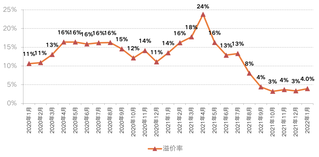 從周度數(shù)據(jù)來(lái)看,春節(jié)后首周受上海、杭州多宗商辦地高溢價(jià)成交拉動(dòng),平均溢價(jià)率回升至8%,創(chuàng)2022年重點(diǎn)監(jiān)測(cè)城市近一年來(lái)周度成交溢價(jià)率新高。