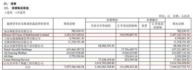 一個是2014年收購英國百貨公司HOF產(chǎn)生的商譽,加上后來匯率波動的影響截止2017年底,這部分的商譽余額是33.87億元。一個是2017年并表齊魯干細(xì)胞新增商譽約30.15億元。以下為公司2017年年報中披露的商譽明細(xì)情況: