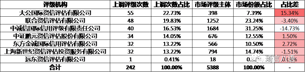 通過對主體評級上調數據中的評級機構進行統計分析,見下圖: