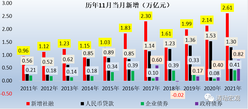 1、受專項(xiàng)債券集中發(fā)行以及地產(chǎn)企業(yè)發(fā)債放松等因素推動(dòng)。例如,今年10-11月政府債券新增1.43萬(wàn)億元,同比多增0.54萬(wàn)億元。今年11月,受11月基數(shù)較低(永煤等地方國(guó)企違約事件)等因素影響,企業(yè)債券同比多增534億元。