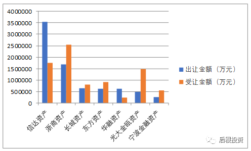 圖中數(shù)據(jù)為持牌AMC在整個不良市場所有收包、出包金額統(tǒng)計。從對比數(shù)據(jù)上看,僅信達資產(chǎn)和華融資產(chǎn)出讓金額>受讓金額;長城資產(chǎn)收、出包金額相對平衡。