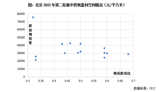 從盈利空間角度看,本輪北京土拍地價(jià)房?jī)r(jià)比平均值為0.49,房地價(jià)差也均在2萬元/平方米以上。