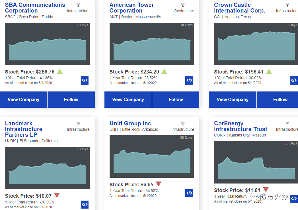 截至目前,根據Nareit網站披露的信息,美國基礎設施REITs(infrastructure  REITs)一共有六只,如下圖所示: