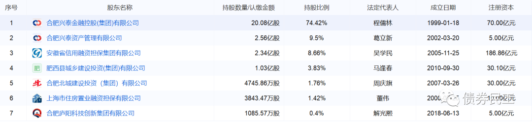 合肥興泰擔保的控股股東是合肥興泰金融控股(集團)有限公司,實際控制人為合肥市國資委。從股東構成來看,合肥興泰的股東以合肥本地企業為主,當然股東中還包括安徽省信用融資擔保集團有限公司(主體信用等級為AAA)。