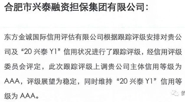 根據合肥市興泰融資擔保集團有限公司(以下簡稱“合肥興泰擔保”)2022年5月24日的公告信息,東方金誠國際信用評估有限公司將公司的主體信用等級由AA+調升至AAA。合肥興泰擔保成為了安徽省第二家AAA擔保公司。