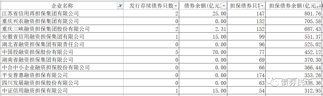 根據wind資訊截至2022年5月25日的統計信息,目前國內專業擔保公司中擔保債券余額最大的為江蘇省信用再擔保集團有限公司,擔保債券余額為801.76億元;擔保債券只數最多的為平安普惠融資擔保有限公司,擔保債券只數為174只;發行債券存續只數最多和債券余額最大的均為中國投融資擔保股份有限公司,分別為5只和70億元。