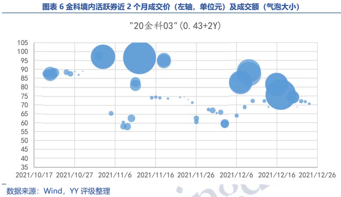 金科近兩月加強(qiáng)了債券投資人溝通,對(duì)于市場(chǎng)傳聞及負(fù)面輿情反應(yīng)也較為迅速,聲稱無(wú)任何融資逾期。從活躍券“20金科03”成交來(lái)看,11月初及12月初曾一度跌至60元以下,隨后隨著金融監(jiān)管機(jī)構(gòu)對(duì)房企融資釋放暖意,債券價(jià)格有所回升,目前在70元檔位。