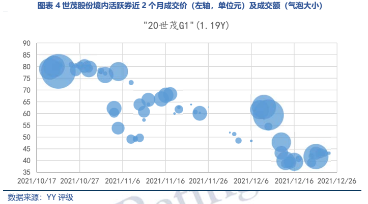 11月5日世茂股債雙殺,境內(nèi)活躍券“20世茂G1”跌至50元檔,而12月10日世茂被爆出信托展期談判后,加劇市場(chǎng)對(duì)其流動(dòng)性的擔(dān)憂,債券價(jià)格進(jìn)一步下探至40元檔。2022年一季度,世茂面臨公開(kāi)到期債務(wù)33.5億元境內(nèi)債+35.84億元供應(yīng)鏈ABS+5億元ABS。