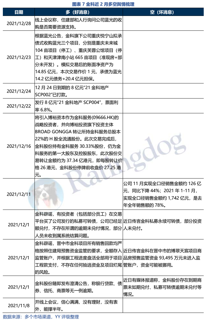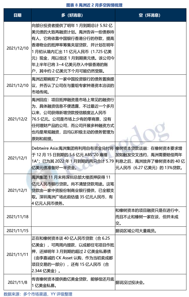 禹洲最臨近的到期公開(kāi)債務(wù)分別是2022年1月的5.79億美元債+4月35億境內(nèi)債回售+3億供應(yīng)鏈ABS,近兩個(gè)月公司主要的輿情均與再融資相關(guān):