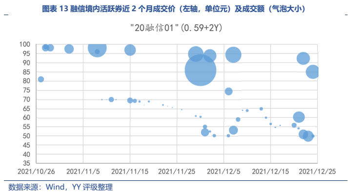 公開(kāi)信息顯示融創(chuàng)2021年12月有14億元ABS+1.5億元供應(yīng)鏈ABS到期,2022年一季度有35億元公司債+10億元ABS到期,此外訪談信息顯示一季度到期債務(wù)還有77億元貸款+20~30億元信托+境外融資4億元美金(有部分是質(zhì)押萬(wàn)達(dá)股票)。境內(nèi)活躍券“20融創(chuàng)02”成交凈價(jià)自10月底來(lái)一路下跌,12月初在一行兩會(huì)表態(tài)后有一波上漲,隨后繼續(xù)下跌,目前在49元左右。