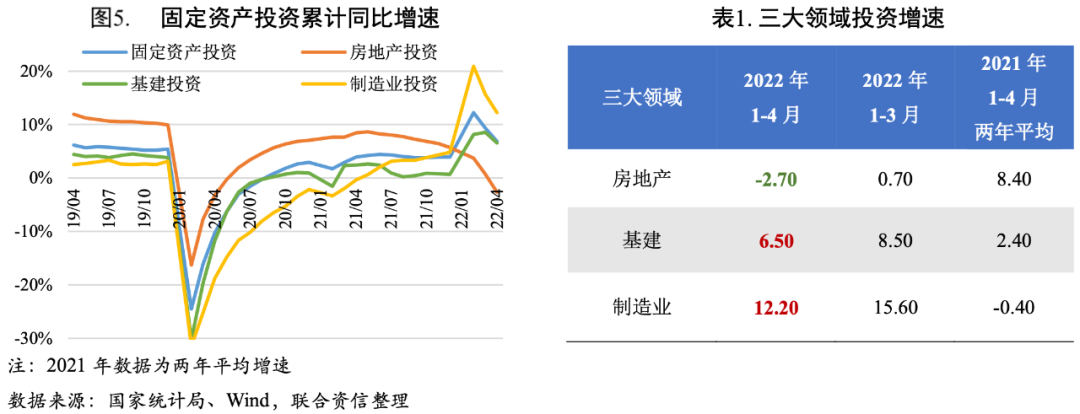 固定資產(chǎn)投資增速回落,房地產(chǎn)投資繼續(xù)探底。2022年1-4月全國固定資產(chǎn)投資(不含農(nóng)戶)15.35萬億元,同比增長6.80%,較1-3月回落2.50個(gè)百分點(diǎn),4月季調(diào)環(huán)比下降0.82%。三大領(lǐng)域方面,房地產(chǎn)開發(fā)投資繼續(xù)探底,1-4月房地產(chǎn)投資同比增速轉(zhuǎn)為負(fù)值,4月商品房銷售面積與銷售額同比降幅繼續(xù)擴(kuò)大,抑制房地產(chǎn)投資,房企新開工、拿地更加謹(jǐn)慎;基建投資有所回落,財(cái)政提前發(fā)力帶來的高增長效應(yīng)減弱,目前基建資金較為充足,但受疫情拖累施工影響,投資向?qū)嵨锕ぷ髁哭D(zhuǎn)化偏慢;制造業(yè)投資受疫情沖擊相對(duì)較小,但未來制造業(yè)投資增長動(dòng)能的持續(xù)性有待觀察。