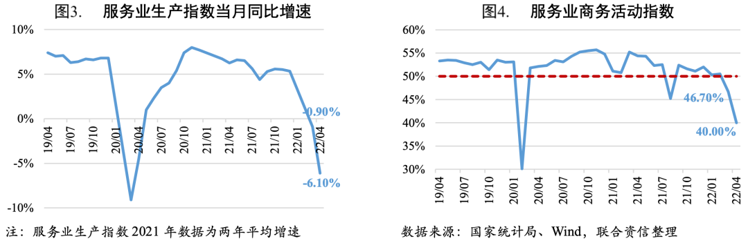服務(wù)業(yè)生產(chǎn)收縮幅度進(jìn)一步擴(kuò)大。4月服務(wù)業(yè)生產(chǎn)指數(shù)同比下降6.10%,降幅較3月擴(kuò)大5.20個(gè)百分點(diǎn);4月服務(wù)業(yè)商務(wù)活動(dòng)指數(shù)也進(jìn)一步下滑至40%,為2020年3月以來的最低值。疫情防控所采取的封閉隔離等措施,對(duì)服務(wù)業(yè)造成重創(chuàng),其中消費(fèi)性服務(wù)業(yè)及部分民生保障類服務(wù)行業(yè)受到?jīng)_擊最大。