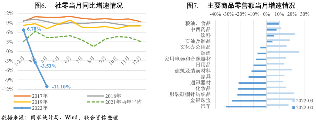 消費(fèi)大幅降溫,非生活必需品和餐飲銷售受疫情沖擊較大。2022年4月社會(huì)消費(fèi)品零售總額(下稱“社零”)2.95萬億元,同比下降11.10%,其中餐飲收入同比降幅擴(kuò)大至22.70%。限額以上商品方面,糧油、食品、中西藥品及飲料銷售額保持增長,生活必需品消費(fèi)韌性顯現(xiàn);油價(jià)繼續(xù)支撐石油及制品銷售額同比增長;汽車、金銀珠寶、服裝鞋帽等非生活必需品以及家用電器、建筑及裝潢材料和家具等房地產(chǎn)鏈條商品銷售額同比大幅下降。