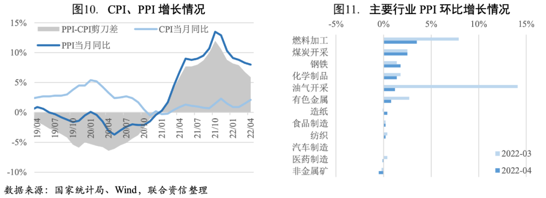 CPI同比漲幅有所擴(kuò)大,PPI漲幅繼續(xù)回落。CPI方面,受國內(nèi)疫情及國際大宗商品價(jià)格持續(xù)上漲等因素影響,2022年4月CPI同比漲幅擴(kuò)大0.60個(gè)百分點(diǎn)至2.10%,環(huán)比由持平轉(zhuǎn)為上漲0.40%。其中,疫情導(dǎo)致的物流不暢以及囤貨需求增加推動(dòng)食品價(jià)格同比和環(huán)比均由跌轉(zhuǎn)漲;國際油價(jià)支撐汽油、柴油等能源價(jià)格繼續(xù)上漲。PPI方面,國際大宗商品價(jià)格仍在高位運(yùn)行,但各地區(qū)各部門堅(jiān)決貫徹落實(shí)保供穩(wěn)價(jià)決策部署,4月PPI同比和環(huán)比漲幅均有所回落,同比漲幅較3月回落0.30個(gè)百分點(diǎn)至8.00%。從主要行業(yè)來看,國際原油、有色金屬等大宗商品價(jià)格高位震蕩,國內(nèi)燃料加工、化學(xué)制品、有色金屬等相關(guān)行業(yè)價(jià)格漲幅回落;受鐵礦石、焦炭等原材料價(jià)格上漲等因素影響,黑色金屬冶煉和壓延加工業(yè)價(jià)格環(huán)比漲幅有所擴(kuò)大。4月PPI-CPI剪刀差繼續(xù)收窄,但5月以來歐盟對(duì)俄羅斯原油的制裁令使得對(duì)供給端的擔(dān)憂情緒升溫,推動(dòng)國際原油價(jià)格重新上行,中下游企業(yè)成本端壓力仍然較大,盈利情況改善預(yù)期轉(zhuǎn)弱。