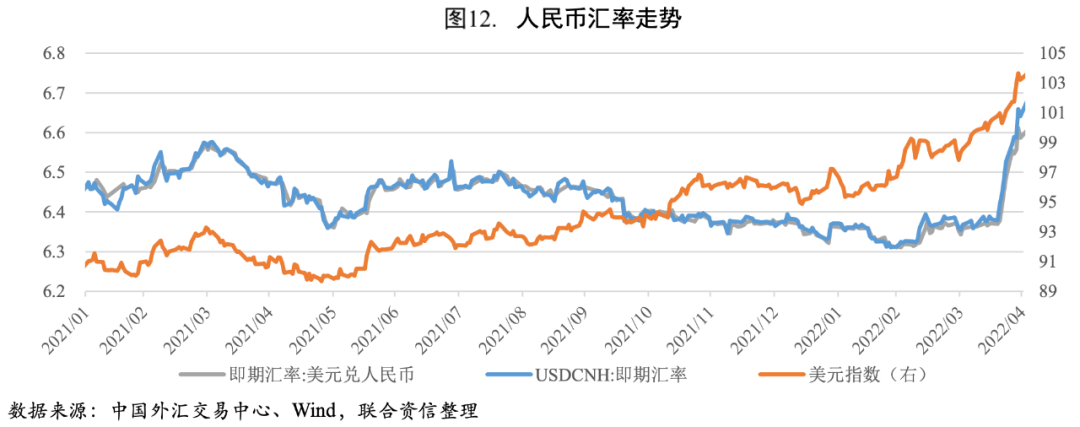 匯率方面,4月人民幣對(duì)美元即期匯率寬幅震蕩持續(xù)走弱。其中,在岸人民幣對(duì)美元即期匯率從上月末的6.3433下行至本月末的6.5866,累計(jì)貶值約3.7%;離岸人民幣對(duì)美元即期匯率從上月末的6.3548下行至本月末的6.6414,累計(jì)貶值約4.3%。人民幣匯率持續(xù)走弱主要原因在于:一是受國內(nèi)疫情沖擊和海外需求回落影響,出口增速大幅放緩,國內(nèi)經(jīng)濟(jì)下行壓力加大;二是受中美利差持續(xù)收窄甚至出現(xiàn)利率倒掛、中概股問責(zé)等因素影響,境內(nèi)資金外流壓力有所增加;三是受俄烏沖突引發(fā)全球避險(xiǎn)情緒上升及美聯(lián)儲(chǔ)加速緊縮貨幣政策影響,美元指數(shù)快速上行,加劇人民幣匯率貶值壓力。