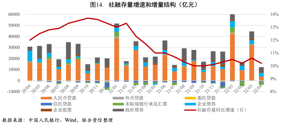 2022年4月,疫情對(duì)實(shí)體經(jīng)濟(jì)的影響進(jìn)一步顯現(xiàn),疊加房地產(chǎn)市場(chǎng)預(yù)期弱化、要素短缺及原材料等生產(chǎn)成本上漲等因素影響,居民消費(fèi)意愿和購房意愿依舊偏弱,企業(yè)經(jīng)營困難增多,有效融資需求明顯下降,社融總量與結(jié)構(gòu)雙雙走弱。央行綜合運(yùn)用多種貨幣政策工具,保持流動(dòng)性合理充裕,充分發(fā)揮貸款市場(chǎng)報(bào)價(jià)利率改革效能,發(fā)揮存款利率市場(chǎng)化調(diào)整機(jī)制作用,推動(dòng)降低企業(yè)綜合融資成本,著力改善信用環(huán)境。