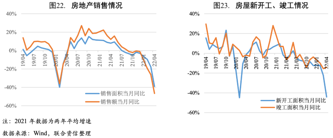 2022年4月房地產(chǎn)基本面進(jìn)一步下探。2022年以來,多地適度放開限購限售、降低公積金使用門檻、調(diào)降房貸利率、加快房貸審批節(jié)奏,但在政策放松的同時(shí),4月銷售額同比降幅進(jìn)一步擴(kuò)大至46.59%。房地產(chǎn)銷售端惡化拖累房地產(chǎn)投資同比增速轉(zhuǎn)負(fù),房企對(duì)于拿地、新開工更加謹(jǐn)慎。