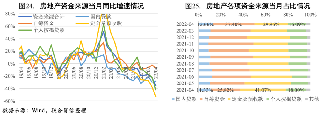 房企銷售回款承壓明顯,資金面壓力進(jìn)一步加大。從房地產(chǎn)資金面來看,4月房地產(chǎn)企業(yè)到位資金1.04萬億元,同比降幅擴(kuò)大至35.54%,資金面壓力進(jìn)一步加大。分項(xiàng)來看,國內(nèi)貸款降幅有所收窄,表明銀行端對(duì)到位資金的支持力度有所加大;而房地產(chǎn)銷售疲弱帶動(dòng)定金及預(yù)收款以及個(gè)人按揭貸款同比降幅繼續(xù)擴(kuò)大,其中定金及預(yù)收款下降超50%;自籌資金超過定金及預(yù)收款成為房地產(chǎn)第一大資金來源,反映出目前在銷售回款承壓的情況下,房地產(chǎn)企業(yè)更多的通過自籌資金的方式來緩解現(xiàn)金流壓力,而對(duì)自籌資金的依賴性提高也意味著個(gè)體風(fēng)險(xiǎn)以及資金鏈的脆弱性提高。