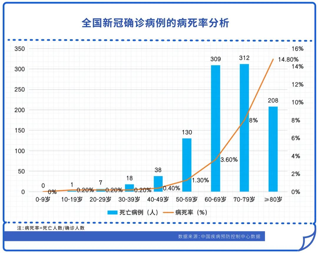 截至2020年2月11日中國疾控中心發(fā)布專項(xiàng)疫情流行病特征分析報(bào)告顯示,老年人屬于死亡病例的重點(diǎn)群體,隨著年齡提高,病死率逐漸攀升,60-69歲病死率為3.6%,70-79歲8.0%,80歲及以上為14.8%。