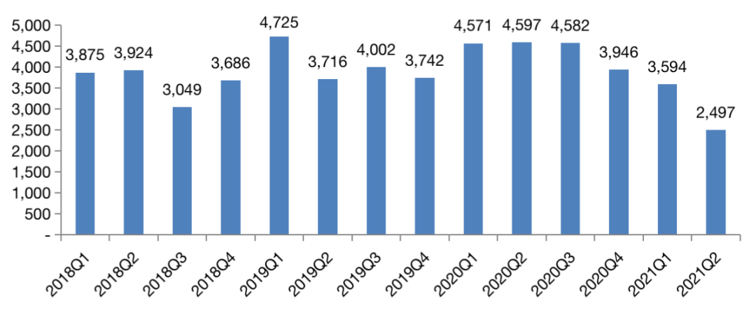 據不完全統計,2021年上半年100家典型房企的融資額為6090億元,同比下降34%,環比下降29%,是2018年以來的最低水平。分季度來看,一季度融資額同環比雙降,且僅高于2018年Q3水平,二季度下降幅度更大。