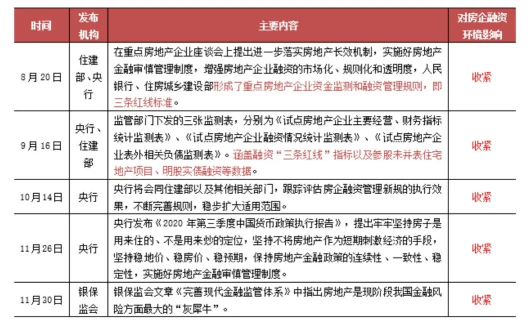 但下半年起,房地產行業融資環境開始發生根本變化,首先是“三條紅線”的出臺,2020年8月20日央行和住建部在北京召開的重點房地產企業座談會上提出了房企融資的“三條紅線”標準,分檔設定房企有息負債的增速閾值,并壓降融資類信托業務規模,倒逼房企去杠桿、降負債。這標志著房地產調控的進一步深入,對后續房企融資的影響十分深遠。