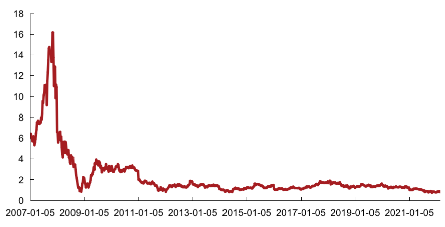 市凈率方面,克而瑞內(nèi)房股領(lǐng)先指數(shù)成分股PB相對(duì)恒指成分股2月小幅震蕩,總體繼續(xù)下行并維持低位。2月相對(duì)恒指PB周均值為-0.9% ,低于上月的周均值-0.1%,低于2021年全年相對(duì)恒指PB周均值22.5%。