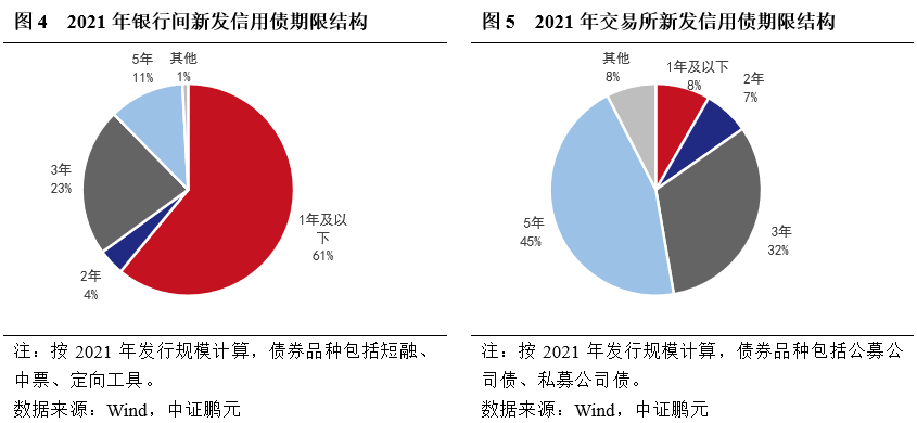 2020年5月,交易所債券市場開始試點短期公司債券。此前交易所債券市場缺乏短期限品種所致的兩市場期限結(jié)構(gòu)差異的現(xiàn)場仍然存在。從2021年的新發(fā)行債券來看,不考慮跨市場品種,銀行間信用債加權(quán)期限為1.70年,交易所信用債加權(quán)期限為4.01年。期限結(jié)構(gòu)上,銀行間信用債以1年期以下短期債券為主,發(fā)行規(guī)模占比61%,5年期及以上長期限債券的發(fā)行規(guī)模占比僅為12%;交易所信用債則以長期限為主,1年期及以下短期債券發(fā)行規(guī)模占比為8%,5年期及以上長期限債券的發(fā)行規(guī)模占比為51%。
