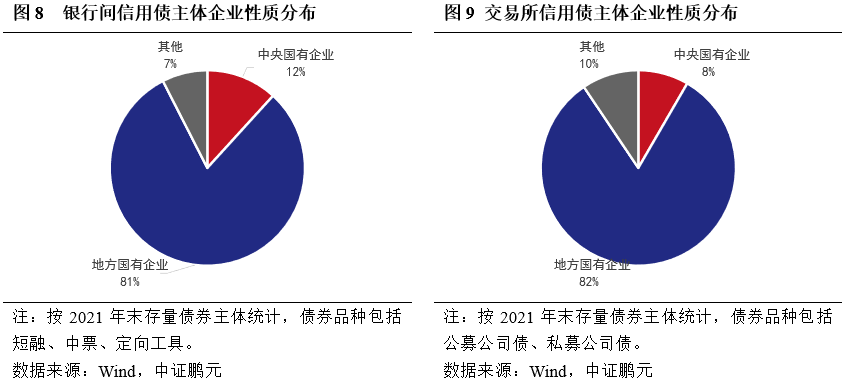 在企業(yè)性質(zhì)上,交易所信用債的非國有性質(zhì)的發(fā)行主體略多于銀行間市場,交易所市場相對更具有包容性。從2021年末存量債發(fā)行主體性質(zhì)分布來看,銀行間信用債非國有發(fā)行主體占比7%,交易所信用債的該比例為10%。