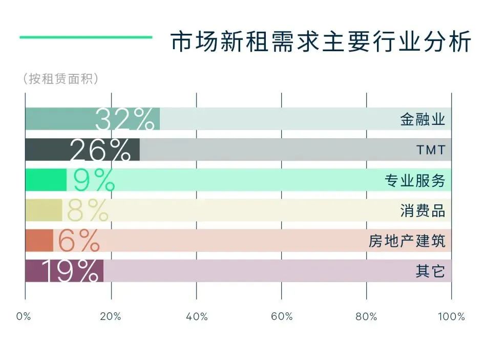 2. 金融行業接棒TMT,成為寫字樓市場主力需求,麗澤商務區的強勁增長拉動整體市場吸納量與租金雙線上揚。