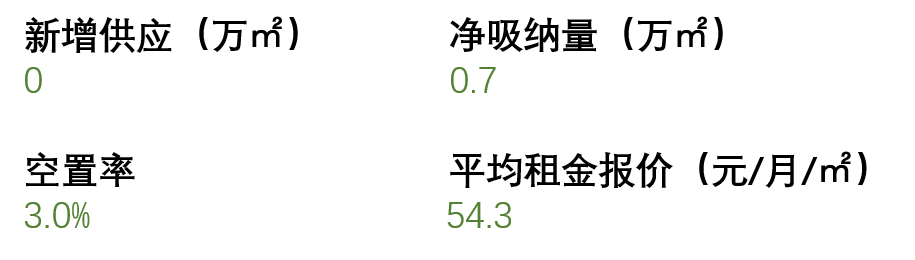 由于可租面積緊俏,本季租賃大多以5,000平方米左右的基本單元面積成交。凈吸納量環比上升58%至6,800平方米,空置率環比下降0.3個百分點至3.0%。