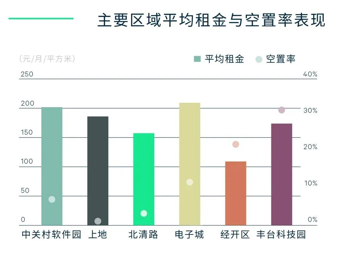 中關村軟件園子市場受沖擊較大,錄得負的凈吸納量;而北清路子市場則憑借租金成本優勢,空置率持續下行;上地、東升租賃活躍度保持平穩。