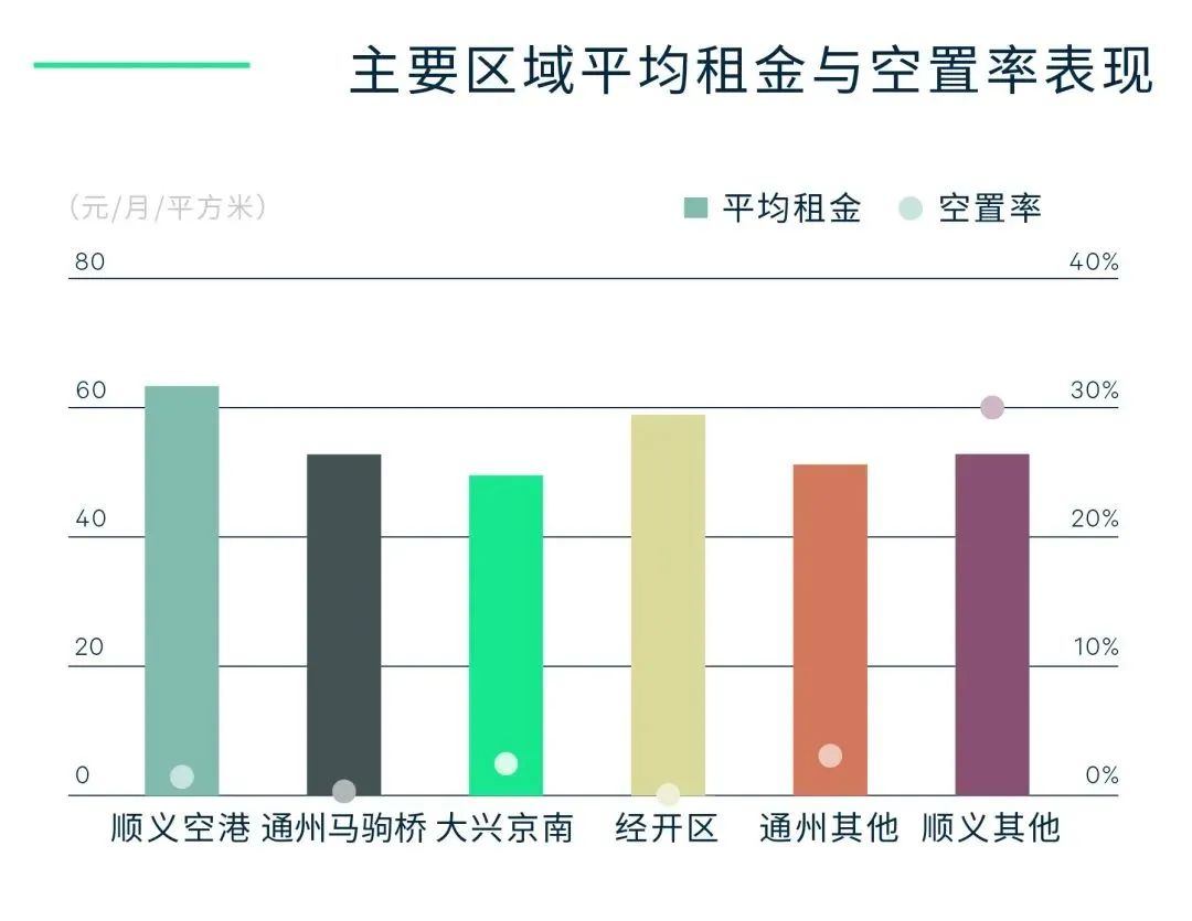 平均租金同樣本比環比增長0.9%至每月每平方米54.3元。經開區和馬駒橋因離市中心最近而成為城市配送需求首選,租金增長最快。