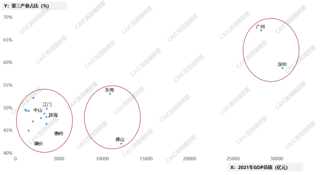 2022年,廣東省“一核一帶一區”區域發展新格局基本確立,其中由韶關、梅州、清遠、河源、云浮組成的北部生態發展區將嚴格控制開發強度,著力發展現代農業、休閑旅游、綠色低碳產業,承接發展引擎區產業轉移的可能性較小。我們關注的九個城市雖然定位為廣東省的發展引擎,但廣深仍遠超其他城市,莞佛位于第二梯隊,其他城市均無突出表現,身為“引擎”,未來產業發展仍需提速。